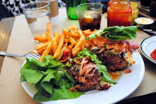 You might think that we would call it a night after this, no way Jose, we went to meet some more of Brooke's friends at another quite swanky bar (I can't tell you the name, have not the foggiest). At the end of the night in the cab on the way home, I apparently insulted one of Brooke's friends by referring to him as a hipster--I had no idea that this would be an insult. I thought that people who were into indie music, wore tight jeans, had thick rimmed glasses, wore sneakers, were into creativity, art appreciation, witty banter, and progressive politics go into the "hipster" category and did not know that it would be considered an insult; did anyone else know that if you called someone a hipster it was an insult?? I apologized profusely for insulting him, letting him know that it was my ignorance. Ah well, something learned, for sure.The next day, we went to an amazing little place called Du Mont for some post-whiskey cheeseburgers and french fries. I had mine sans bun, it was just as delicious. I LOVE a good cheeseburger--nothing like it.